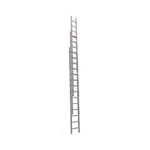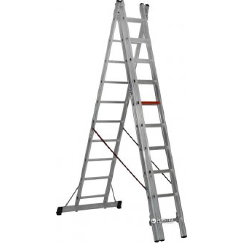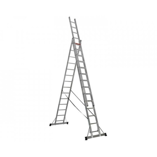 Алюмінієва драбина трисекційна – універсальний атрибут для виконання на висоті монтажних, електротехнічних, клінінгових, ремонтних робіт.3 секції можуть використовуватися як окремі драбини, складатися у форму 2 сторонньої стрем’янки або використовуватися у вигляді букви У (перевернутої). Останнє положення – найвище.