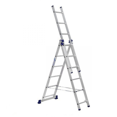 Алюмінієва драбина трисекційна – універсальний атрибут для виконання на висоті монтажних, електротехнічних, клінінгових, ремонтних робіт.3 секції можуть використовуватися як окремі драбини, складатися у форму 2 сторонньої стрем’янки або використовуватися у вигляді букви У (перевернутої). Останнє положення – найвище.