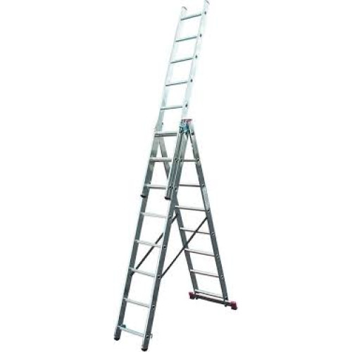 Алюмінієва драбина трисекційна – універсальний атрибут для виконання на висоті монтажних, електротехнічних, клінінгових, ремонтних робіт.3 секції можуть використовуватися як окремі драбини, складатися у форму 2 сторонньої стрем’янки або використовуватися у вигляді букви У (перевернутої). Можна також скласти рівно 3 секції і отримати довгу приставну драбину. Останнє положення – найвище.