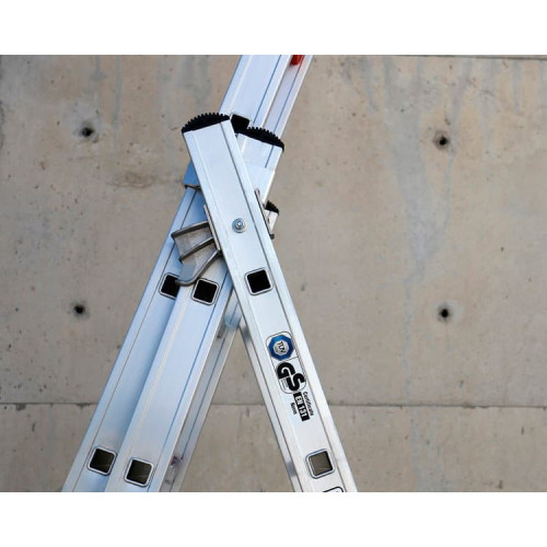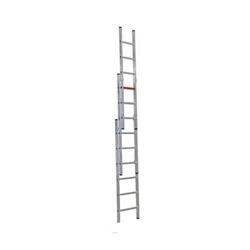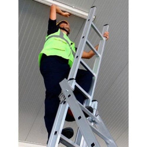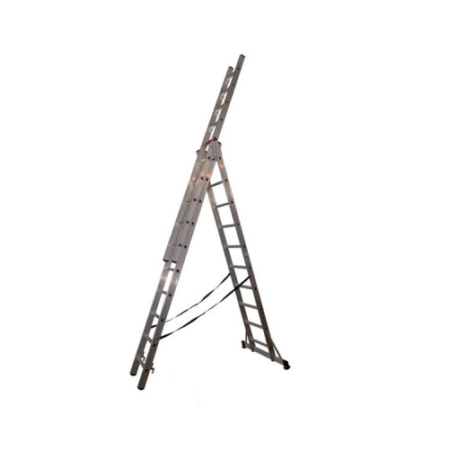 Алюмінієва драбина трисекційна – універсальний атрибут для виконання на висоті монтажних, електротехнічних, клінінгових, ремонтних робіт.3 секції можуть використовуватися як окремі драбини, складатися у форму 2 сторонньої стрем’янки або використовуватися у вигляді букви У (перевернутої). Останнє положення – найвище.