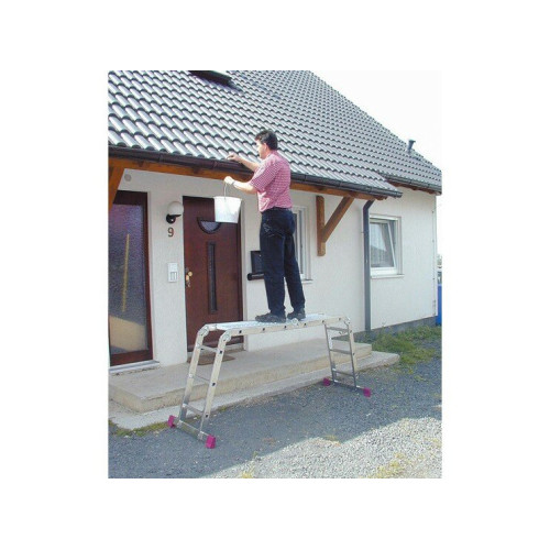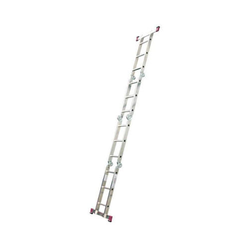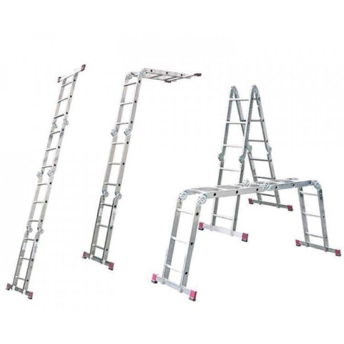 Алюмінієва шарнірна драбина 4 секції по 3 сходинки. Конструкція цієї драбини має багато переваг. Секції шарнірної стрем’янки можна зафіксувати під різними кутами нахилу для регулювання робочої висоти драбини. Особливість цих драбин трансформерів у тому, що їх використовуються також як робочу платформу висотою 1 метр.