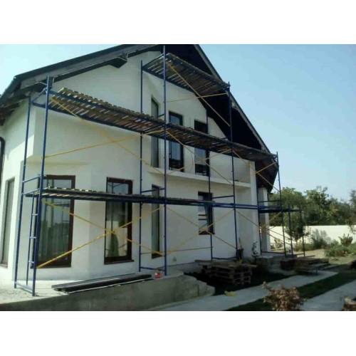 На будівництві риштовка рамного типу використовується для робіт з покриття фасаду, утеплення, ремонту стін, монтажу вентиляції та інших.
