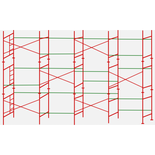 По факту будівельні ліса набираються за принципом конструктора. Для визначення постачальника варто порівняти не лише ціну на комплект риштування, а й кількість елементів. Ми комплектуємо риштування таким чином, щоб стійки були з'єднані і з зовнішньої, і з внутрішньої сторони конструкції. Наглядно схему риштування будівельного 6 метрів висотою на 12 метрів довжиною можна побачити на схемі, наведеній нижче.