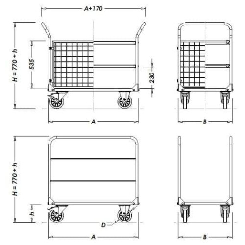 Вартість вантажного візка для складу залежить у тому числі від розміру обраних колес. Вони можуть бути звичайні або посилені. Запитайте у нашого менеджера, яку комплектацію тележки для складу обрати, щоб якнайкраще забезпечити виконання поставлених перед нею завдань.
