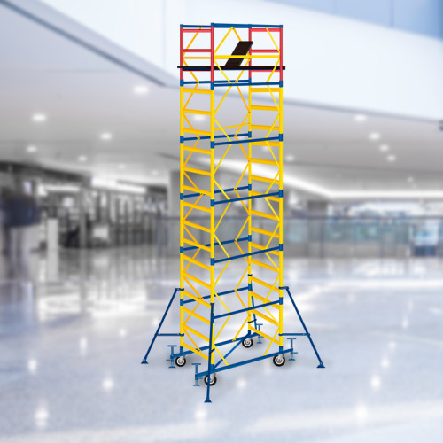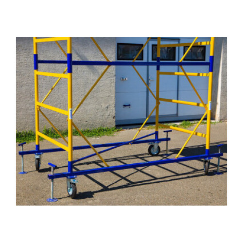Комплектація вишки тури на 11 метрів (8+1) - конструкція з металевих рам-драбин, кожна по 3 сходинки. Паралельні драбини з'єднуються стяжками і створюють секцію. Нижня секція встановлюється на 2 бази з домкратами і колесами, які міцно з'єднані діагоналлю.