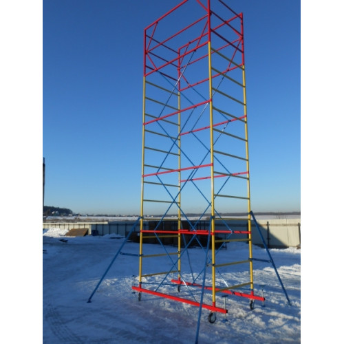 Цей тип риштування – вузькі вишки-тури. Довжина робочої платформи 2 метри і ширина 0,75 метра роблять цю вишку оптимальною для роботи двох працівників одночасно всередині будівлі чи на вулиці. На відміну від риштування на колесах 1,2х2,0 метри вона проходить у двірні отвори. Висота нарощування – до 10 метрів, чудово підходить для використання всередині високих приміщень таких, як спортзали, храми, торгові центри та ін.