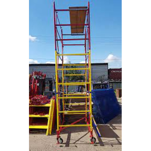 Цей тип риштування – вузькі вишки-тури. Довжина робочої платформи 2 метри і ширина 0,75 метра роблять цю вишку оптимальною для роботи двох працівників одночасно всередині будівлі чи на вулиці. На відміну від риштування на колесах 1,2х2,0 метри вона проходить у двірні отвори. Висота нарощування – до 10 метрів, чудово підходить для використання всередині високих приміщень таких, як спортзали, храми, торгові центри та ін.