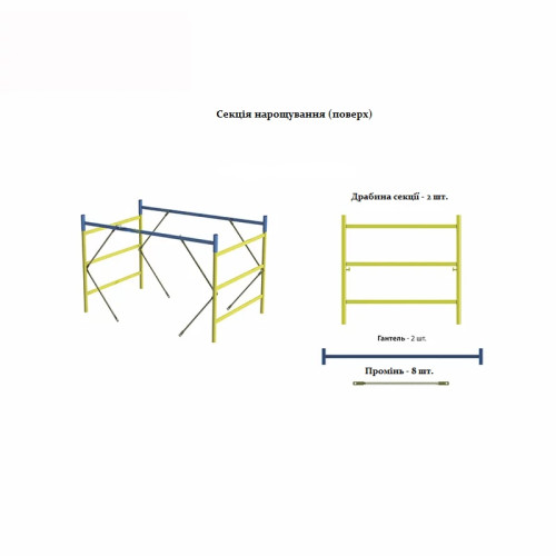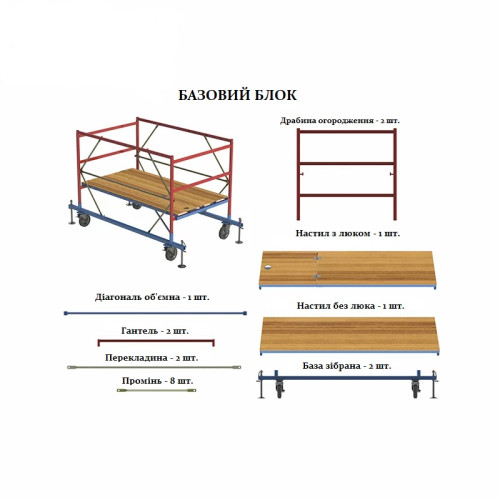 Тура має стандартну комплектацію – базовий блок на колесах і домкратах, поверхи нарощування та дерев’яні щити. Додатково можна замовити металеві стабілізатори для укріплення стійкості вишки тури на великій висоті або нерівній поверхні.